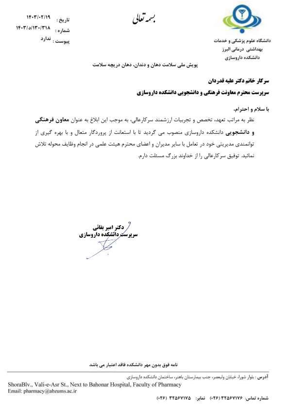 به گزارش روابط عمومی و بر اساس حکمی از سوی دکتر امیر بقائی رئیس دانشکده، دکتر علیه قدردان به عنوان معاون فرهنگی و دانشجویی دانشکده داروسازی منصوب شد.