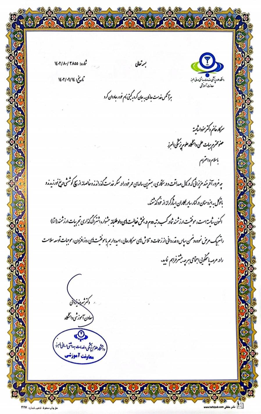 دکتر سئودا شایسته موفق به کسب رتبه دوم در بخش فعالیت های داوطلبانه جشنواره اشتراک گذاری تجربیات ارزشمند (اتا) شد.