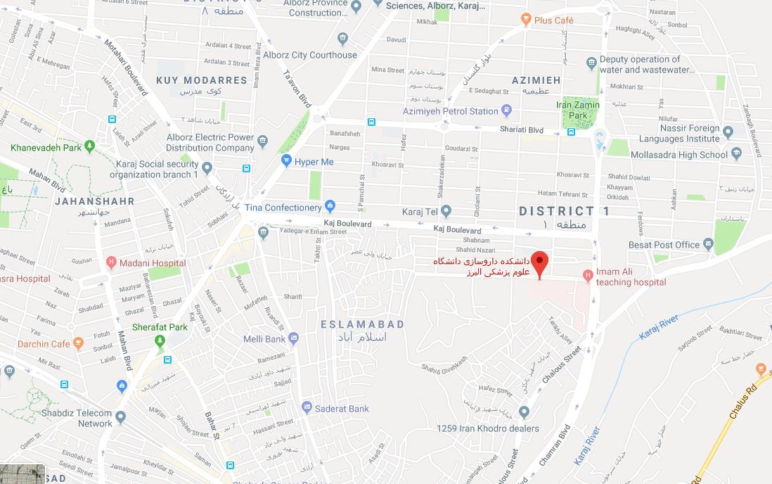 آدرس :کرج - عظیمیه -بلوار ولیعصر(عج)-جنب بیمارستان امام علی(ع)-ساختمان دانشکده داروسازی
